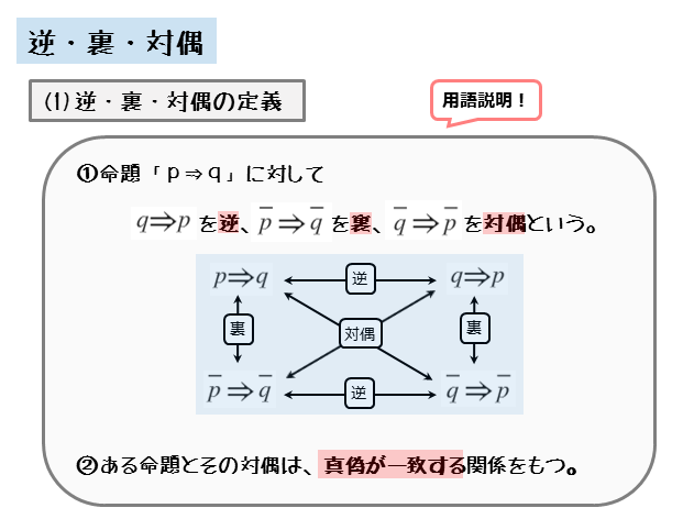 そのようなとき、命題の逆、裏、対偶を利用すると、命題の真偽を簡単に判定できることがあります。
