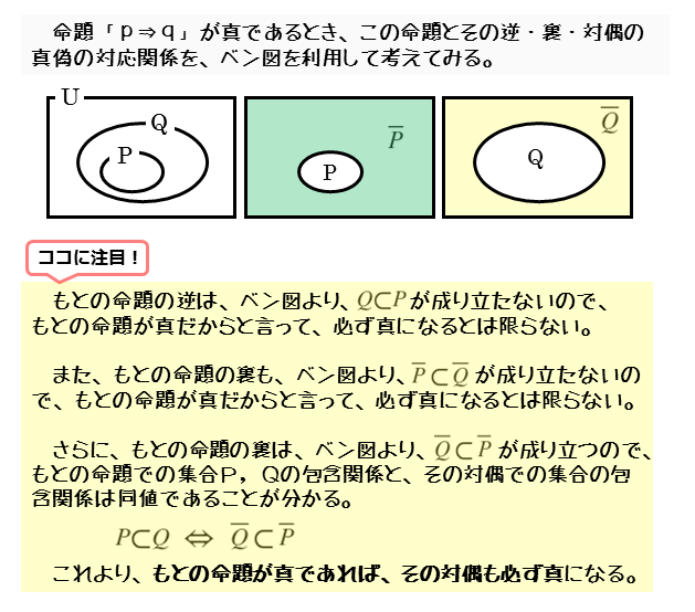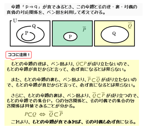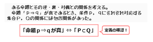 ある命題「p⇒q」が真であるとします。このとき、条件p,qに対応する集合P,Qには、P⊂Qという包含関係があります。