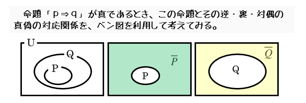 ベン図を使いながら、命題が真であるときの逆、裏、対偶の真偽を調べてみましょう。