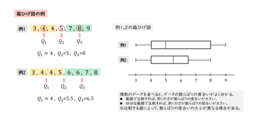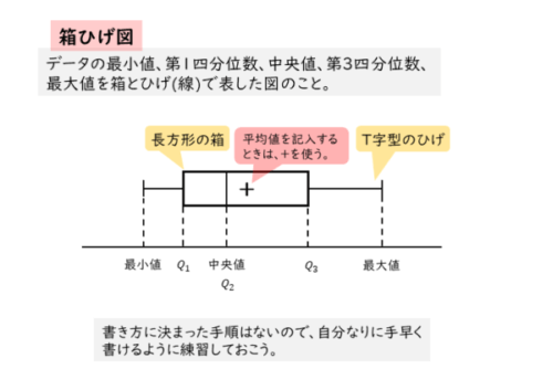 - 箱ひげ図 … データの最小値、第1四分位数、中央値(第2四分位数)、第3四分位数、最大値を箱とひげ(直線)で表したもの