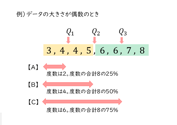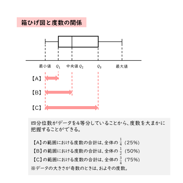 データの大きさが偶数であれば、データが四分位数によってきれいに4等分(2個ずつに分割)されていることが分かります。このことから、特定の範囲にある度数の全体に占める割合が分かります。