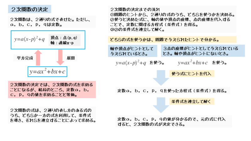 \begin{align*} &\quad y = ax^{2} +bx +c \ \text{(一般形)} \\[ 7pt ] &\quad y = a \left( x-p \right)^{2} +q \ \text{(標準形)} \end{align*}ですから、2次関数の決定とは、結局のところ、係数や定数項などの定数a,b,c,p,qを決定すると言った方が適切かもしれません。
