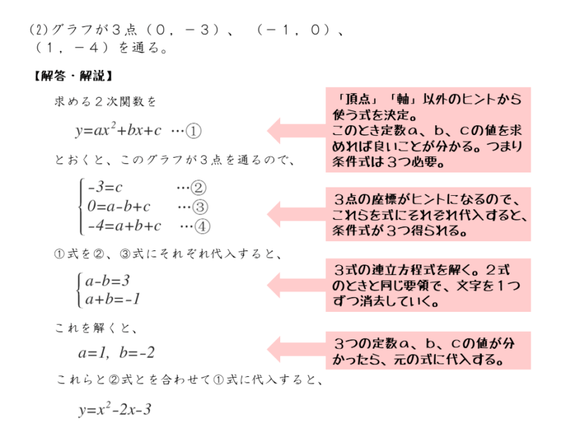 グラフが通る $3$ 点 … 点 $(0 \ , \ -3) \ , \ (-1 \ , \ 0) \ , \ (1 \ , \ -4)$