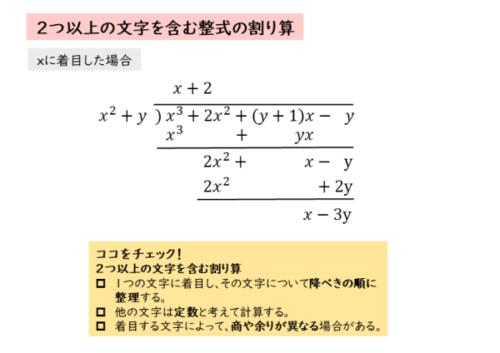 今回は、2つ以上の文字を含む整式の割り算について学習しましょう。