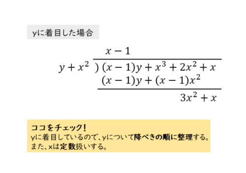 また、文字yに着目したときの割り算は以下のようになります。文字yに着目するので、文字xを定数と同じように扱います。
