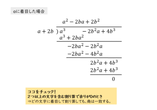 また、どの文字に着目するかで、割り算の結果が変わってしまいます。2つ以上の文字を含む整式では、これまで以上に注意して計算する必要があります。
