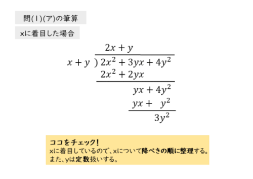 文字xに着目したときの割り算は以下のようになります。文字xに着目するので、文字yを定数と同じように扱います。