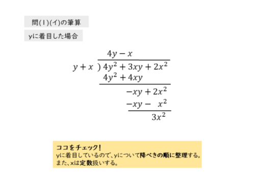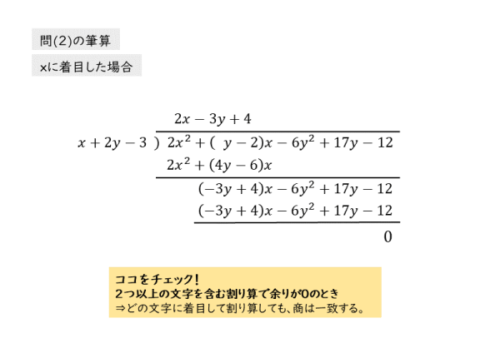 文字yに着目した場合でも、割り切れ、商が一致します。割り切れることは事前に分かっているので、丁寧に筆算し、計算ミスのないようにしましょう。