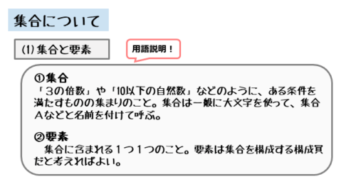 「集合と論理」という単元では、集合とそれに属する要素について学習しました。