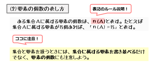 集合が属する要素の個数は「n(集合の名称)」の形で表されます。