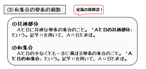 共通部分の要素はどちらの集合にも属しているので、単に2つの集合A,Bの要素を合わせてしまうと、要素が重複します。