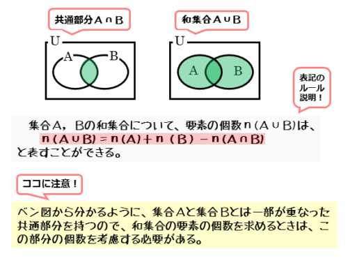 2つの集合A,Bの和集合の要素の個数を求めるには、共通部分のぶんだけ重複した要素の個数を除かなければなりません。