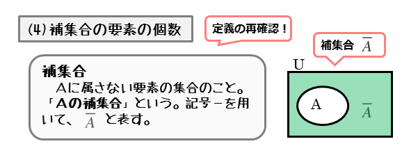 \begin{align*} \quad n(\overline{A}) = n(U)-n(A) \end{align*}$n(\overline{A})$ … 補集合 $\overline{A}$ の要素の個数
