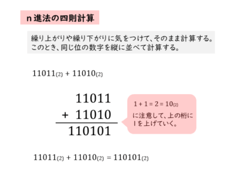 2進法であれば、0と1を用いて数を表す記数法なので、和が2になると上の桁に1だけ繰り上げます。足りないときは下の桁に2を繰り下げます。10ではないので注意しましょう。