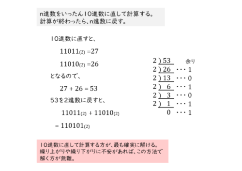 「繰り上がり」や「繰り下がり」をどのように行うかは底(nのこと)によって決まりますが、10進法と区別できないと簡単に間違えてしまいます。慣れるまでは丁寧に演習をこなした方が良いでしょう。