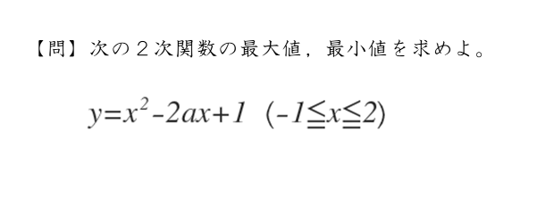 \begin{align*} \quad y={x}^{2}-2ax+1 \quad \left(-1 \leqq x \leqq 2 \right) \end{align*}場合分けが必要な問題であっても、最初にやることは与式を標準形に変形することです。
