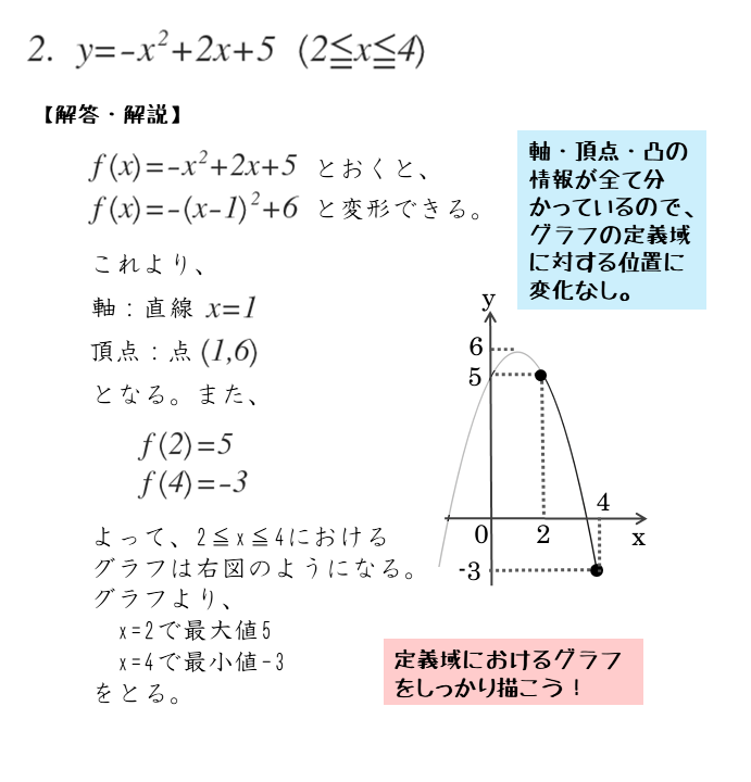 最大値や最小値をとる点は、頂点や定義域の両端の点のどれかになる。グラフをしっかり描こう。