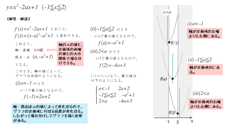 3つの場合から、aについての不等式が場合分けの条件となることが分かります。定数aの値が定まらなければ、2次関数の最大値や最小値を求めることができないのですから当然です。