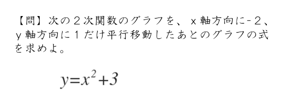 次の $2$ 次関数のグラフを、$x$ 軸方向に $-2$、$y$ 軸方向に $1$ だけ平行移動したあとのグラフの式を求めよ。