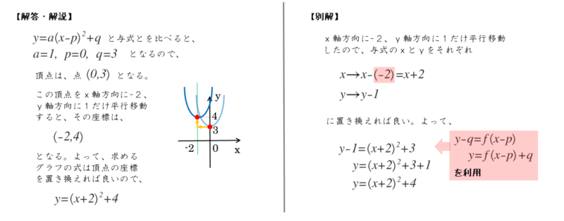 別解として、一般化したグラフの平行移動の考えを利用する解法もあります。応用的な解法になりますが、慣れるとかなり簡単に解けるようになります。