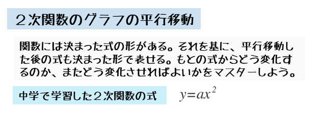 2次関数のグラフは、中学で学習した2乗に比例する関数のグラフを平行移動したもの。2乗に比例する関数は、2次関数の一例。
