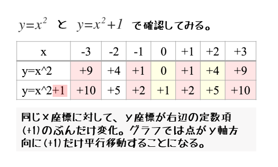 このような平行移動をしたとき、移動後の式は右辺に定数項qが加わった式に変わります。
