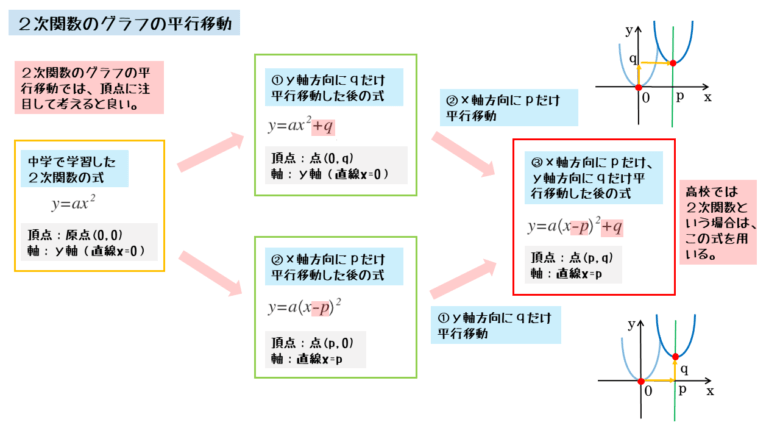 2乗に比例する関数y=ax2のグラフをx軸方向にpだけ、y軸方向にqだけ平行移動したときの式は以下のようになります。また、頂点や軸についてもまとめておきます。