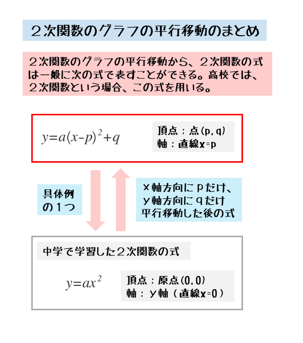 なお、関数y=ax2をx軸方向およびy軸方向に平行移動して得られる式y=a(x-p)2+qを「2次関数の標準形」として用います。