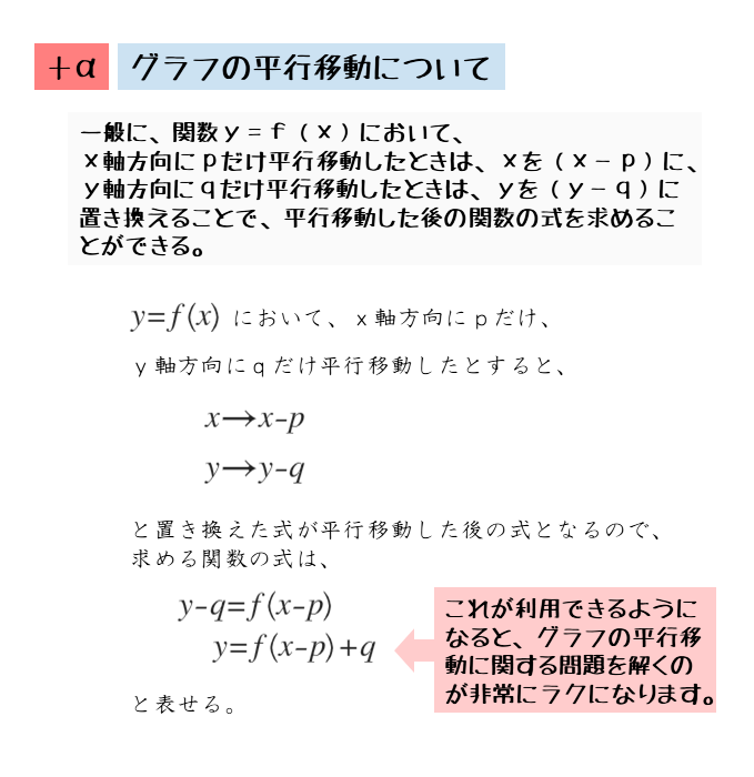 このことは、2次関数だけではなく関数全般で成り立ちます。この性質を上手に利用できるようになると、どんな関数でも平行移動後の式を簡単に求めることができます。