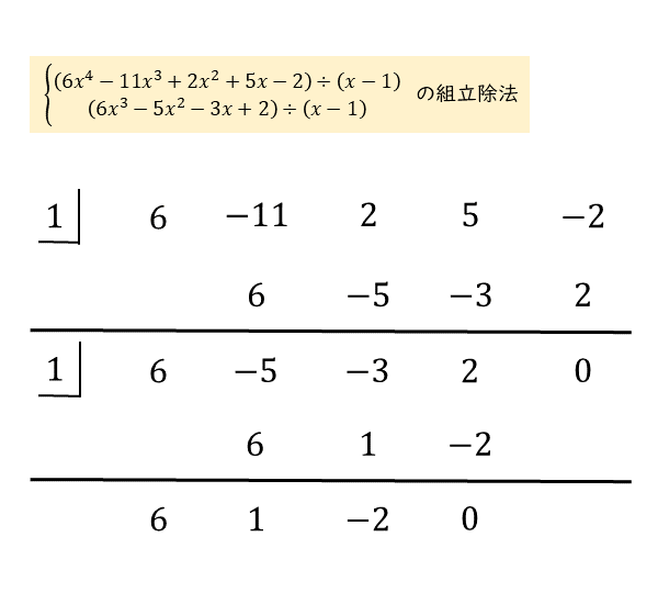 2度目の組立除法の結果は以下の通りです。2度目の組立除法は1度目の結果の下に続けて記述します。