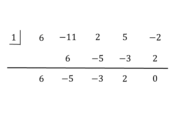 &\quad P(1)=6 \cdot 1^{\scriptsize{4}}-11 \cdot 1^{\scriptsize{3}}+2 \cdot 1^{\scriptsize{2}}+5 \cdot 1-2=0 \\[ 7pt ]