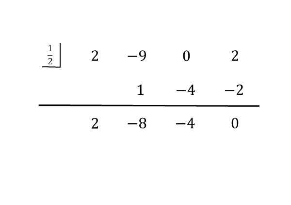 &\quad P\left(\frac{1}{2} \right)=2 \cdot \left(\frac{1}{2} \right)^{\scriptsize{3}}-9 \cdot \left(\frac{1}{2} \right)^{\scriptsize{2}}+2=0 \\[ 7pt ]