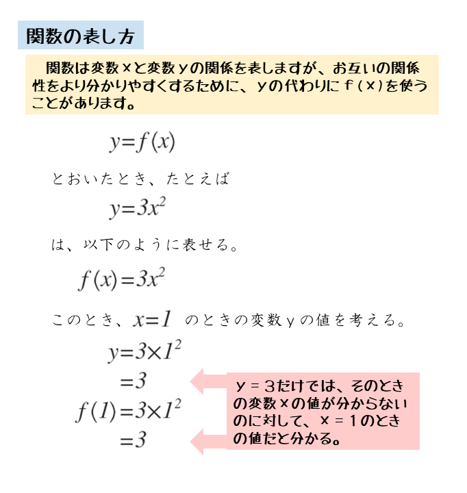 2つの変数x,yの値の関係がより分かるように、y=f(x)とおくことがあります。このようにすると、変数yの代わりにf(x)を使って表すことができます。