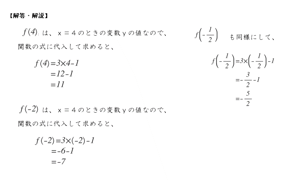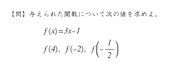 \begin{align*} &\quad f(x)=3x-1 \\[ 7pt ] &\quad f(4) \ , \ f(-2) \ , \ f \left(-\frac{1}{2} \right) \end{align*}問で与えられた関数は、変数yの代わりにf(x)を用いて表されています。f(4)はx=4のときのyの値を表します。
