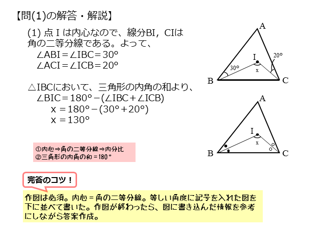 \begin{align*} \quad x = 130^{\circ} \end{align*}問(1)のポイントと解答例をまとめると以下のようになります。