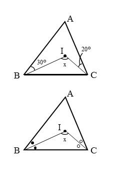 \begin{align*} &\quad \angle {ABI} = \angle {CBI} = 30^{\circ} \\[ 7pt ] &\quad \angle {ACI} = \angle {BCI} = 20^{\circ} \end{align*}三角形の内角の和より