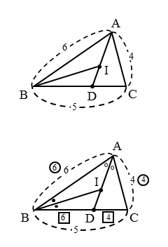 \begin{align*} &\quad BD:DC = AB:AC \\[ 7pt ] &\quad BD:DC = 6:4 = 3:2 \end{align*}$BD:DC=3:2$ より