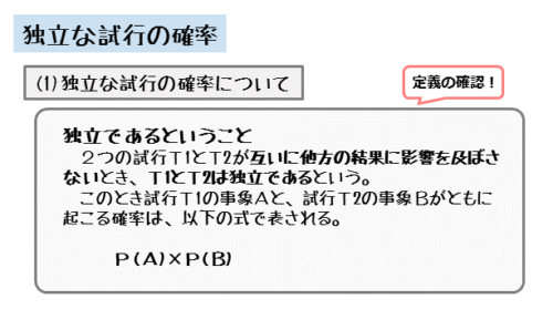 一般に、2つの試行T1,T2があって、この2つの試行が互いに他方の結果に影響を及ぼさないとき、「2つの試行T1,T2は独立である」と言います。