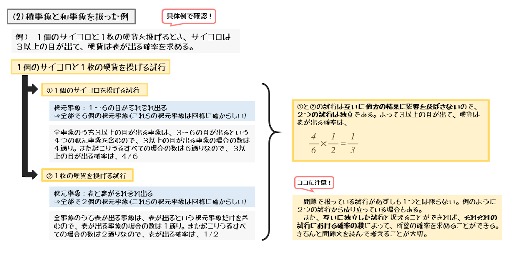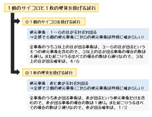 1個のサイコロと1枚の硬貨を投げるという試行は、細かく見ると、1個のサイコロを投げる試行と1枚の硬貨を投げる試行の2つの試行からなると捉えることができます。