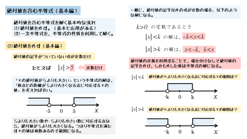 \begin{align*} \quad -k \lt x \lt k \end{align*}上述の不等式は、最も基本となる式です。この形に帰結させることが多いので、すぐに解を求めることができるようにしておきましょう。