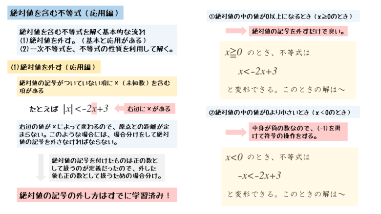 - 残りの項に文字を含む項があるとき、場合分けをして絶対値の記号を外し、不等式を解く。