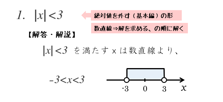 \begin{equation*} \quad \left| x \right| \lt 3 \end{equation*}問1は、絶対値の項と定数項の2項からなる不等式です。基本的な形なので、数直線を利用すれば、場合分けなしで絶対値の記号を外せ、しかも解を求めることができます。
