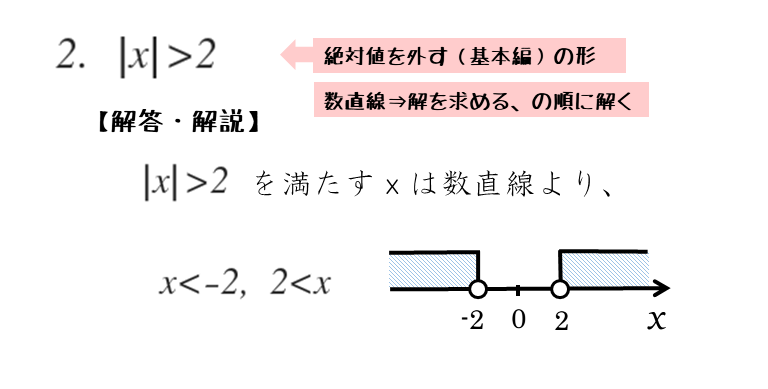 \begin{equation*} \quad \left| x \right| \gt 2 \end{equation*}問2も基本的な形です。数直線を利用して不等式の解を求めます。