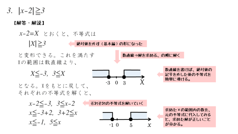\begin{align*} \quad X \leqq -3 \ , \ 3 \leqq X \end{align*}絶対値の記号を外して、不等式の解を求めましたが、問3ではもう少し続きがあります。