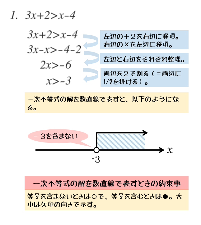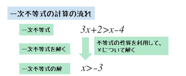 また、一次不等式を解くとは、解を求めることです。一次不等式を解くためには、不等式の性質を利用しながら式を変形します。