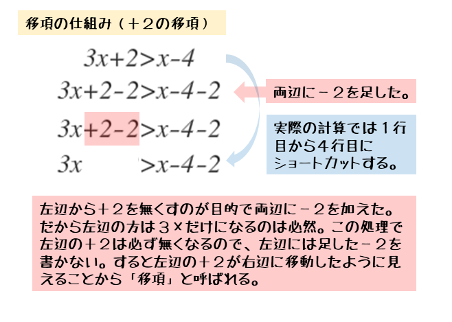 一次方程式や一次不等式を解くとき、両辺に数を加算するのは不要な項をなくすのが目的なので、同じ数を加算するのと同じ効果のある移項で済ませてしまいます。できるだけ記述を楽にする効果があります。