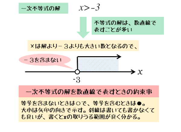 たとえば、解がx>-3であれば、-3より大きい数はすべて解になります。