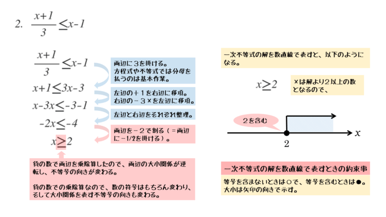 一次方程式と異なるのは、負の数を乗除算するとき。不等号の向きが逆向きになる。