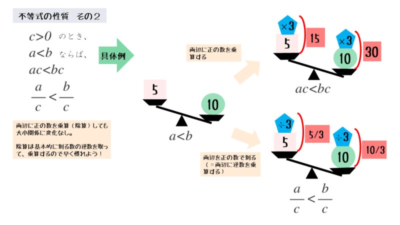 等式の性質では除算も扱いますが、除算は逆数の乗算と考えると、不等式では1つの性質で説明できます。