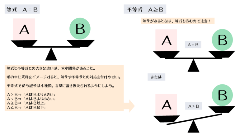 等式や不等式を見たとき、天秤の様子を思い浮かべると2つの数量の関係をイメージしやすい。